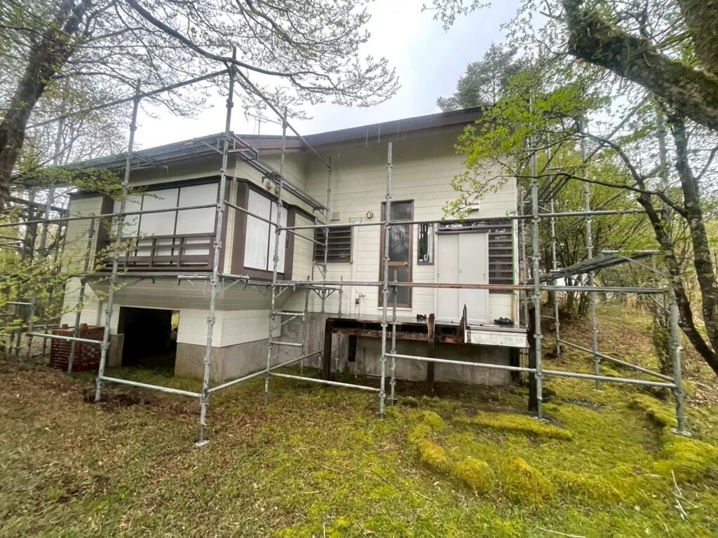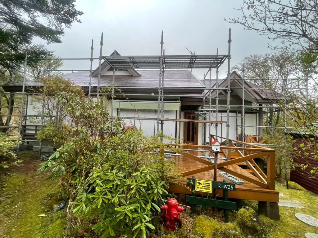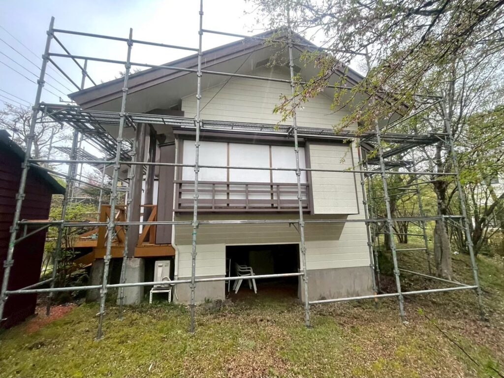 2025.10.13 足場組み𝙸𝙽裾野市 今日は裾野市の屋根上葺き、外壁塗装の現場のご紹介です!! 足場の写真になります!! 自社で足場材を持っていて、自社の職人で足場を組みますので足場屋さんに頼むよりもお安くなっております!